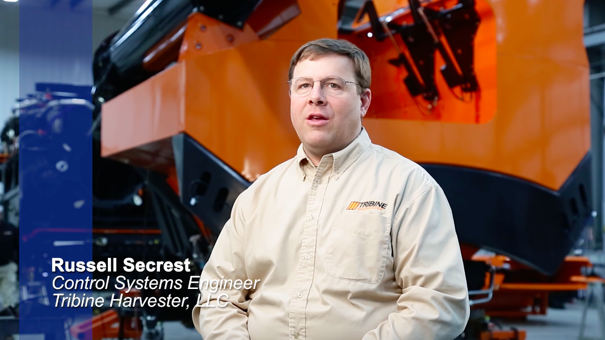 ?Zu den Herausforderungen, vor denen wir bei der Entwicklung standen, gehörten die Ansteuerung der Dreschkörbe rund um den Rotor sowie das Öffnen und Schließen der Korntank-Erweiterungsklappen“, erklärt Russell Secrest, Steuerungsingenieur bei Tribine Harvester. ?Die Anforderungen an die Korntank-Erweiterungen wurden einigermaßen umfangreich, da wir zwei extrem große Klappen öffnen und schließen mussten. Dann haben wir ein weiteres Bauteil in der Mitte, nämlich die Förderschnecke, die das Getreide nach oben in den Korntank befördert.“