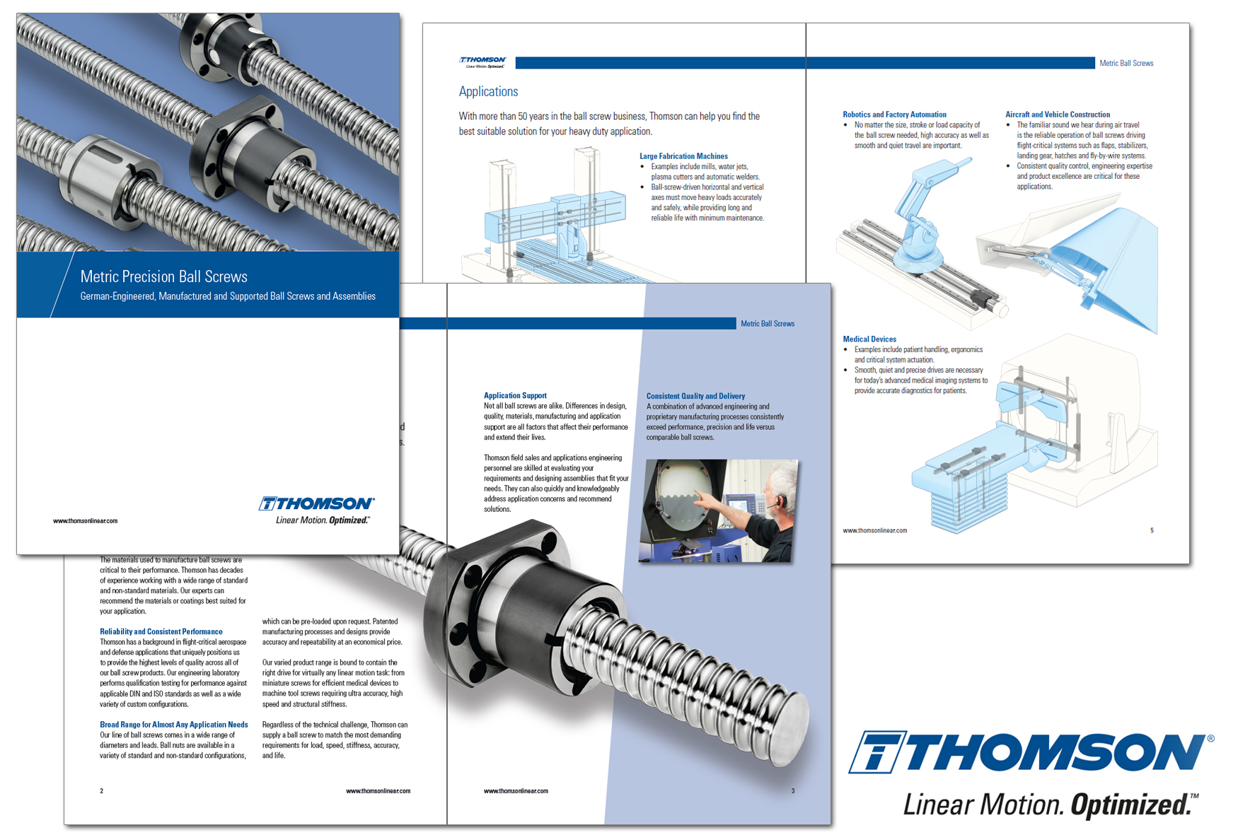 The 12-page brochure calls out features that distinguish Thomson as a leader in the motion control industry, including superior precision, options for standard or custom designs, consistent and reliable performance, broad application range and support, and consistent quality and delivery.