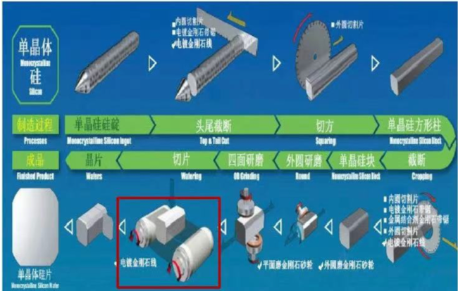 絲杠-也可應(yīng)用在切片機(jī)上,絲杠驅(qū)動(dòng)壓裝機(jī)構(gòu)壓緊硅晶,硅晶下端由旋轉(zhuǎn)的金剛線對(duì)硅晶進(jìn)行切割,可取代傳統(tǒng)的砂漿切片。