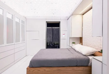 白天,客廳左側(cè)的墻壁滑入客廳,打開家庭辦公室。隔板上的屏幕可旋轉(zhuǎn),為家庭辦公室或客廳提供電話會議和娛樂活動的空間。同樣,客廳和臥室之間的隔墻也可以移動,白天實(shí)現(xiàn)客廳空間的更大化,晚上實(shí)現(xiàn)臥室的最大化。