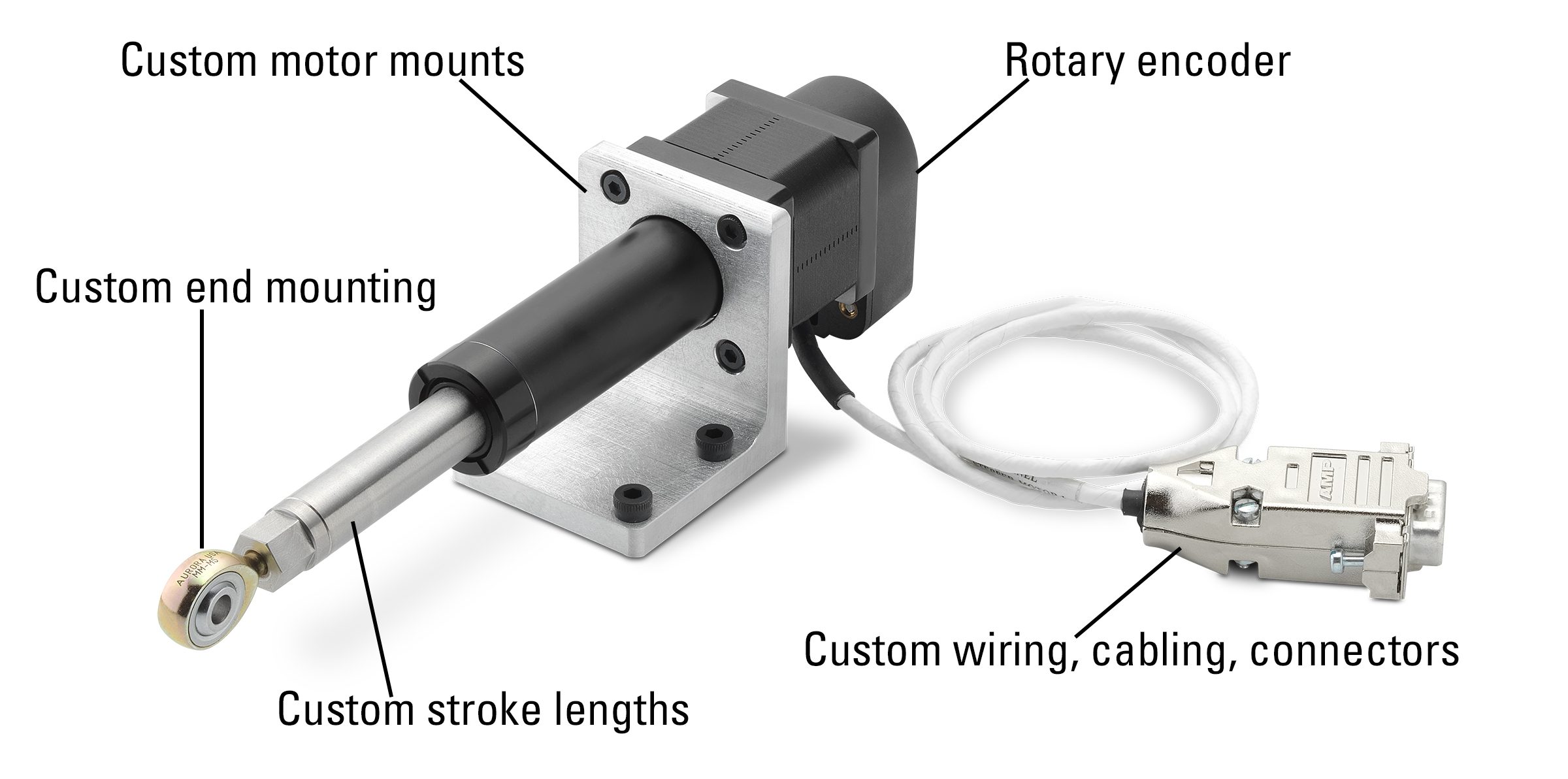 These are but a few examples of customizations. The range of options is wide. You might customize stroke and extracted length down to millimeter scale; enhance control by adding encoders; comply with industry regulations be adding certification; select a more aesthetically pleasing finish; implement a custom adapter housing; or improve voltages or clutch handling. Even those are just mere examples of what could be customized on an electric actuator. This same degree of customization applies to shafting, screws, Ball Bushings®, linear guides and a host of other linear motion components.