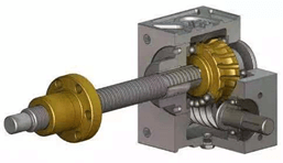 精密蝸輪傳動裝置(蝸桿軸與內螺紋蝸輪)的旋轉運動被轉換成絲杠的軸向直線運動(絲杠穿過齒輪箱外殼),負載安裝在絲杠的端部。